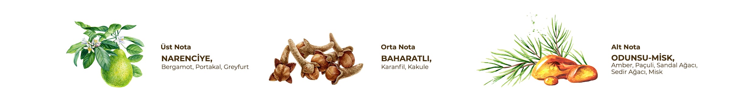 Narenciye bahçelerinden gelen ferah ve canlı bir tazelikle açılır. Bergamot, portakal ve greyfurtun parlak notaları; karanfil ve kakulenin sıcak dokunuşlarıyla dengelenir, misk ve odunsu notalarla yumuşak ve kalıcı bir kapanış sunar.